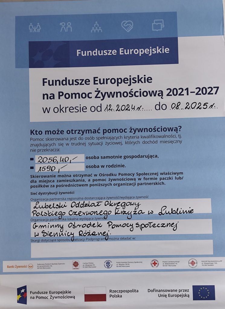 Osoby zainteresowane skorzystaniem z pomocy żywnościowej proszone są o zgłaszanie się do Gminnego Ośrodka Pomocy Społecznej, Siennica Różana 265A, 22-304 Siennica Różana wraz z dokumentami potwierdzającymi wysokość dochodu rodziny lub osoby samotnie gospodarującej (decyzja KRUS lub ZUS, zaświadczenie o wynagrodzeniu).